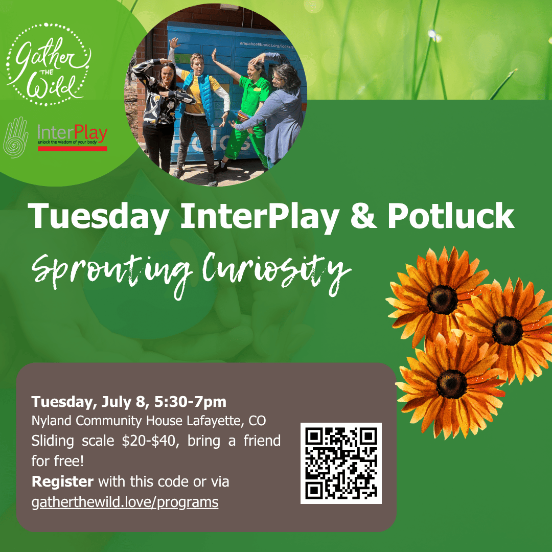 Gather the Wild & InterPlay Colorado welcome all ages to our multigenerational playspace! We bring nature, movement, dance, song, and storytelling together in a full-body experience to connect families and community members with our joyful and embodied wisdom. No experience necessary, all bodies welcome!
